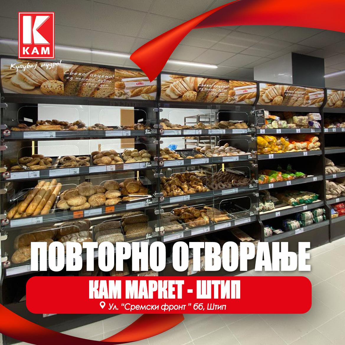 КАМ Ви овозможува проширен продажен простор од 260 м2 со поголема функционалност и прегледност при пазарењето, збогатена понуда на производи и пекара со вкусни печива.